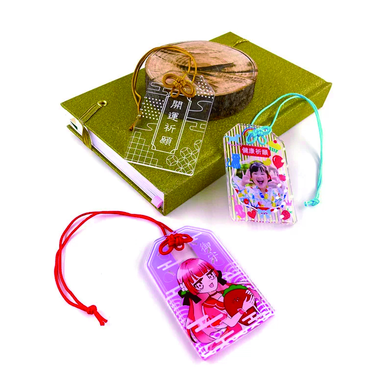 オリジナルデザインのアクリル製のオリジナルお守りが作成出来ます。